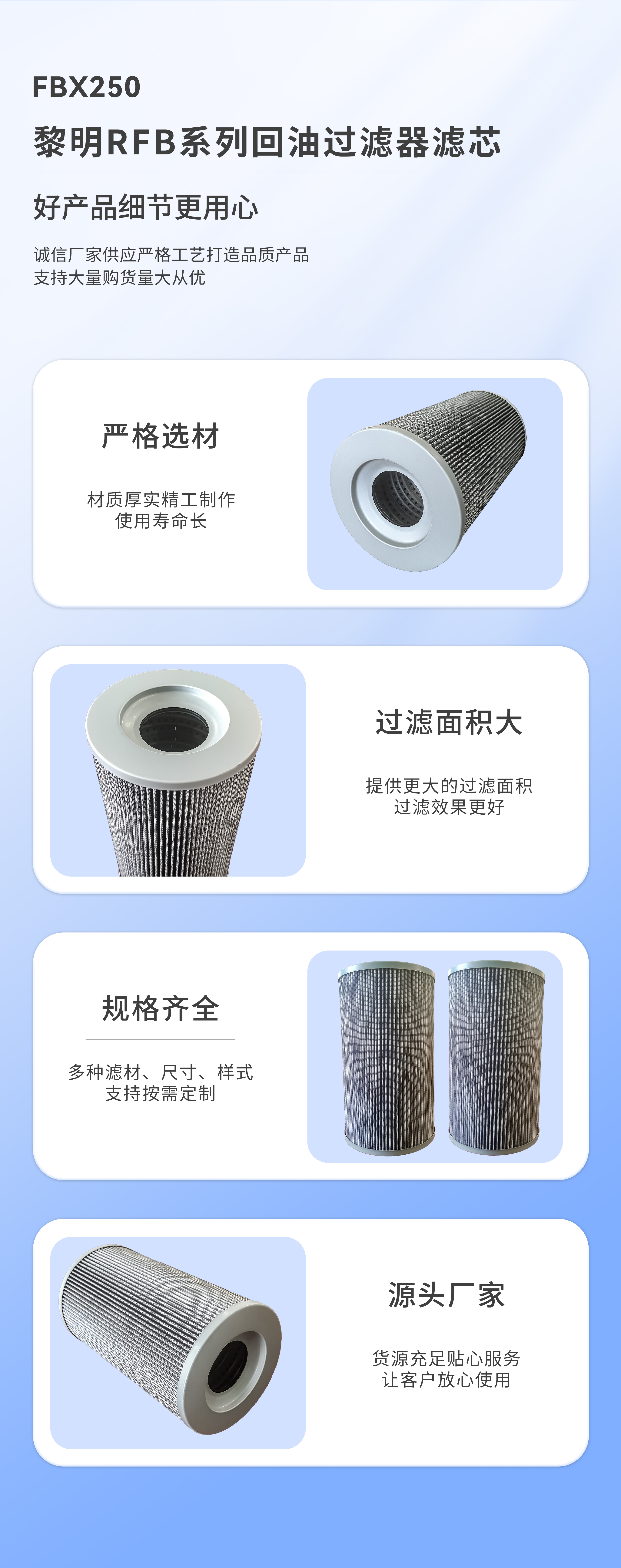 【產(chǎn)品簡(jiǎn)介】:濾芯的濾材一般都要做成波紋狀由3-5層折疊而成,采用濾材成型設(shè)備,這樣才能使多層復(fù)合纖維緊緊靠在支承網(wǎng)上,如果支承網(wǎng)與纖維濾材沒(méi)有靠死,就說(shuō)明它制作工藝欠佳。黎明FBX250回油過(guò)濾器濾芯 流量:250L/min 精度:1、3、5、10、20、30微米可選。